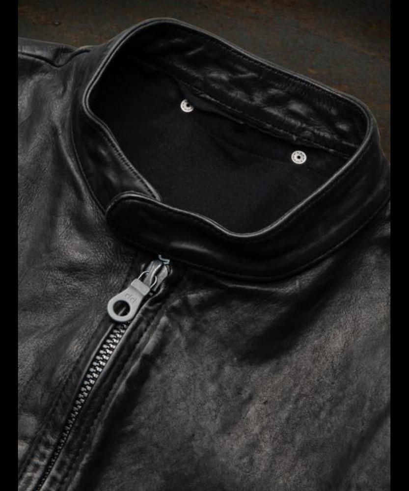 0.8〜0.9mm厚のイタリアンショルダーレザーを採用。多分にオイルを染み込ませた下地をベースに、製品染色を施工。成牛の肩の部分の革を使用した肉厚で重厚感のある硬質な質感を基に、製品染色による陰影を伴ったムラのある荒々しい表情が加わることにより独自の存在感を放つ一着に仕上がっています。ハリのある最初のハードな感覚は、着用を重ねる毎にしっとりと柔らかく、艶感が変化しより一層味わいのある雰囲気に深化していきます。