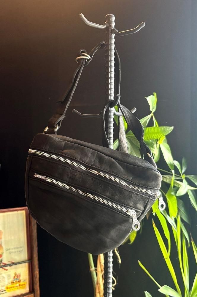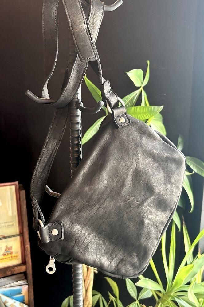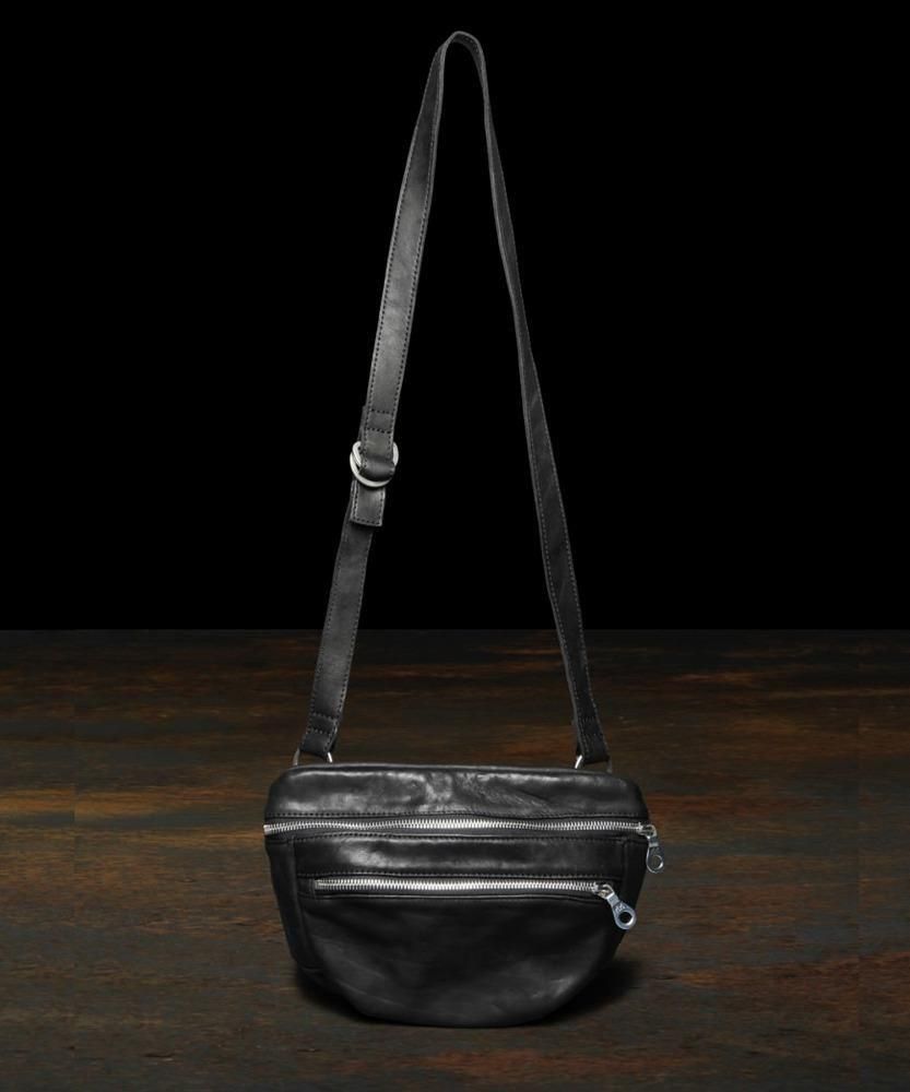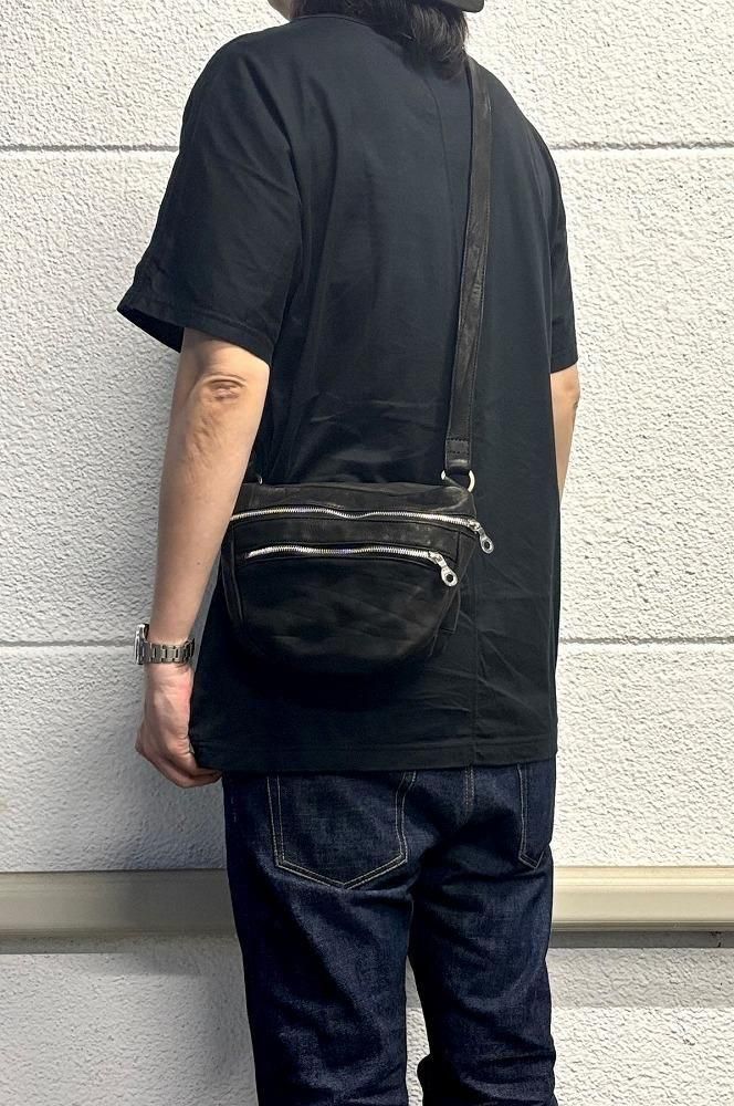 メンズの休日スタイルに、ポケットプラスアルファ感覚で軽く持てるショルダーポーチ/バッグになります。敢えてミニマルなデザインで構築しつつ、マチのある点がポイント、収納量や物の出し入れに便利です。小型ながら製品染色加工のダブルショルダーレザーを採用し、よく手に馴染むサイズ感は早くアジのある表情が作り上げられていきます。リングベルト仕様でストラップの長さ調整が細かく自在に行えます。