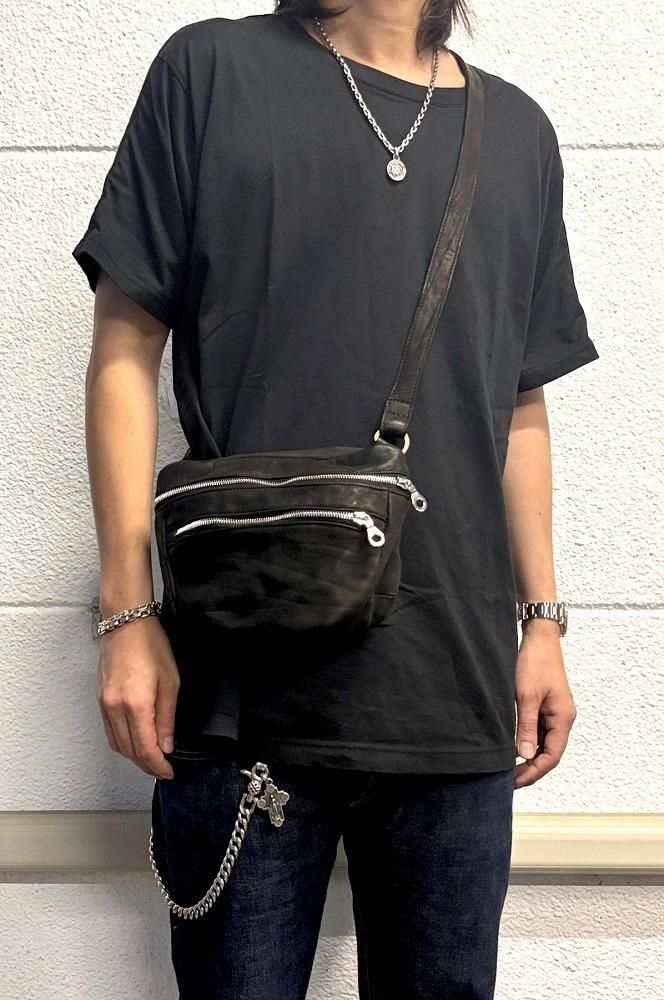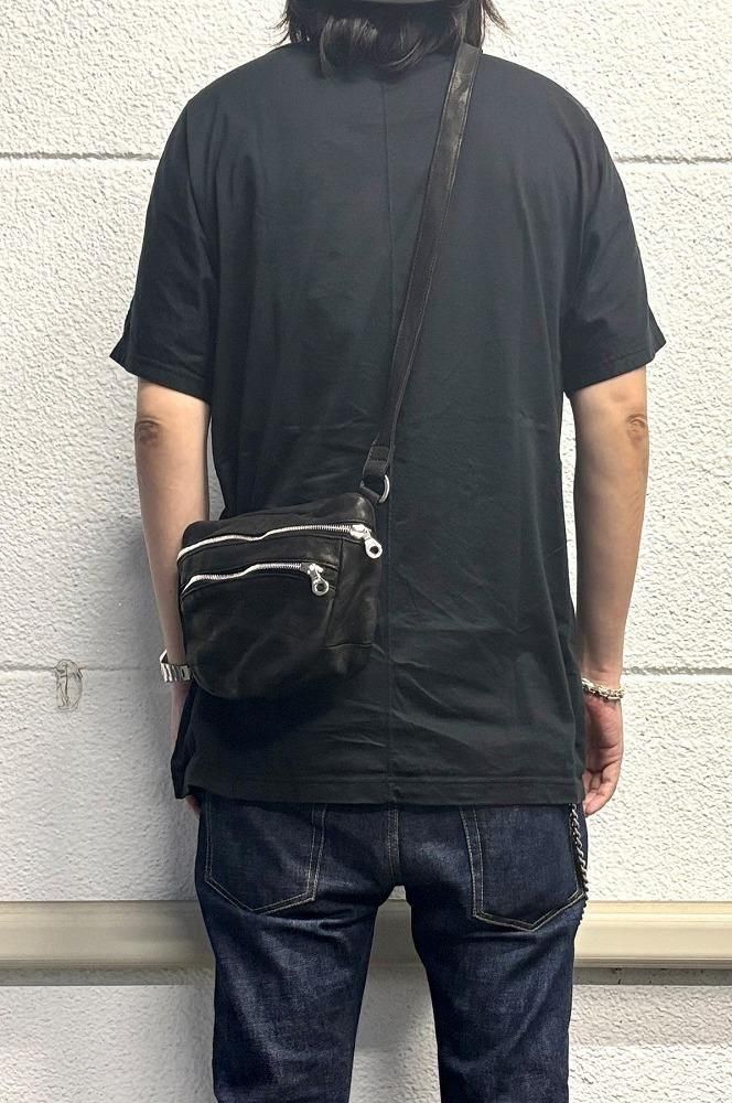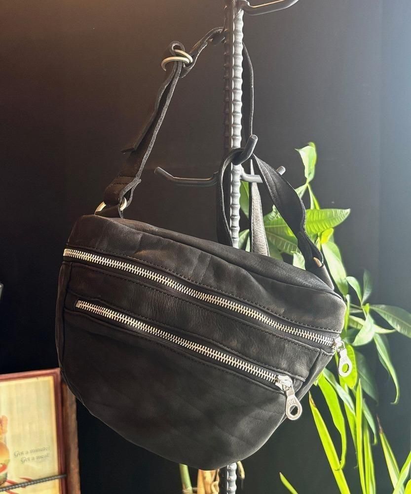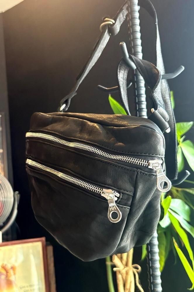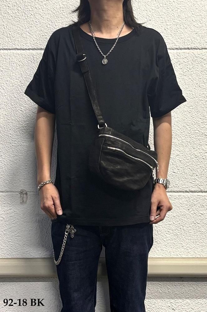 メンズの休日スタイルに、ポケットプラスアルファ感覚で軽く持てるショルダーポーチ/バッグになります。敢えてミニマルなデザインで構築しつつ、マチのある点がポイント、収納量や物の出し入れに便利です。小型ながら製品染色加工のダブルショルダーレザーを採用し、よく手に馴染むサイズ感は早くアジのある表情が作り上げられていきます。リングベルト仕様でストラップの長さ調整が細かく自在に行えます。