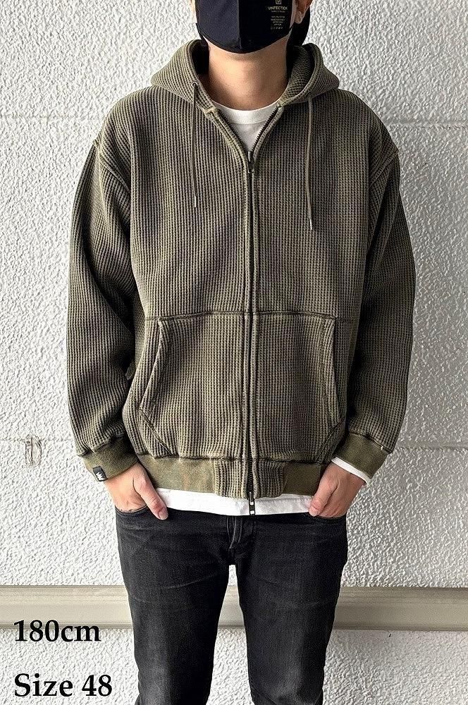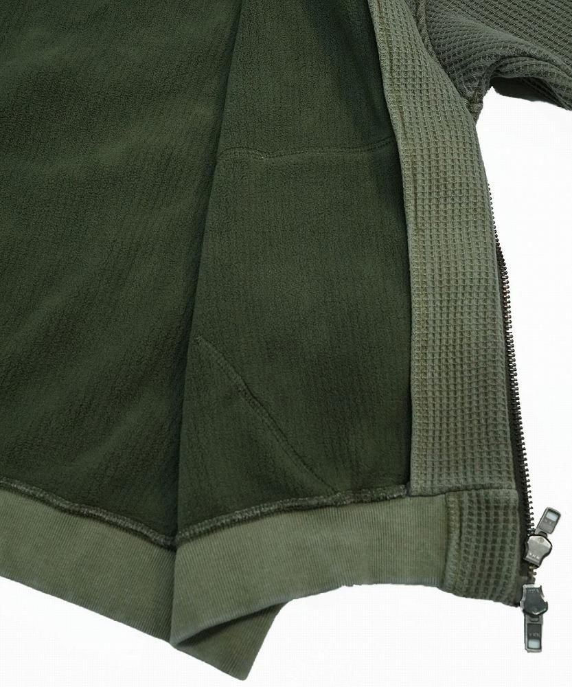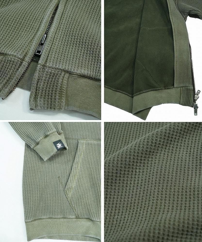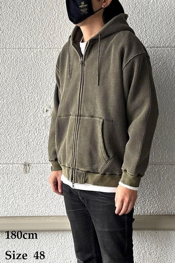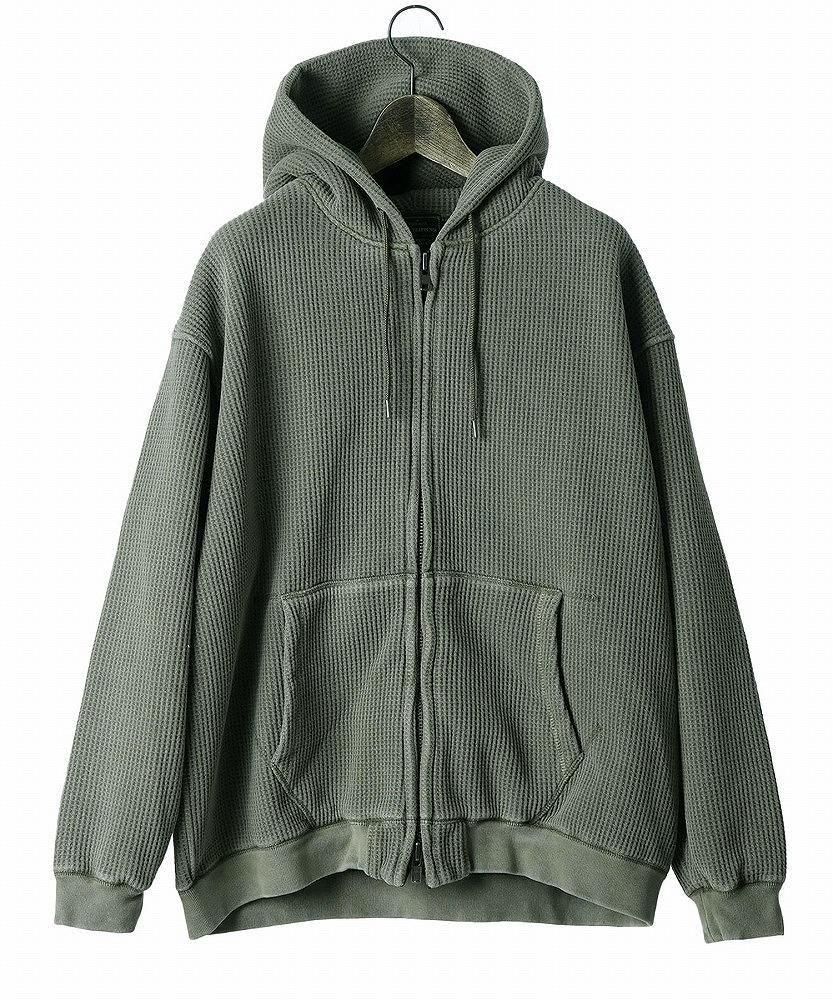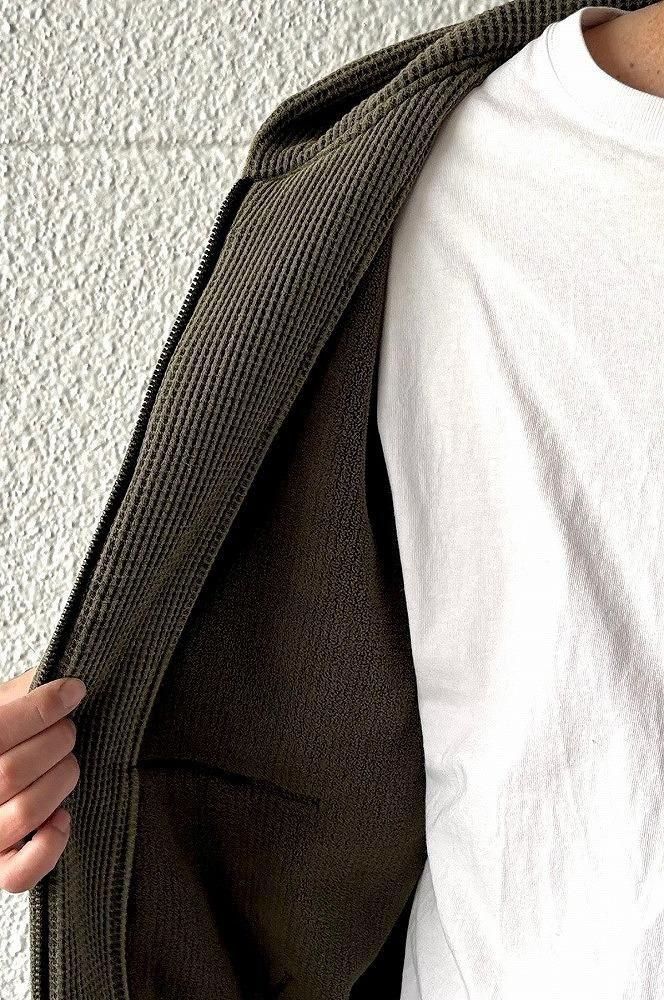 一見すると普通のワッフルジップパーカーですが、袖を通した瞬間にわかる、裏地のフェイクファーの心地よさをぜひ体感してみてください。