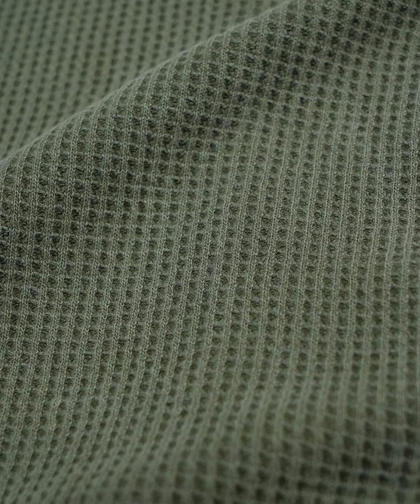 ヘビーオンスのワッフル生地の裏側に、フェイクファーをボンディングするという、他に類を見ない素材を開発しました。この素材は、ワッフルの凹凸が持つ独特の風合いと、フェイクファーの抜群の保温性を兼ね備えた、まさに唯一無二の仕上がりになっています。