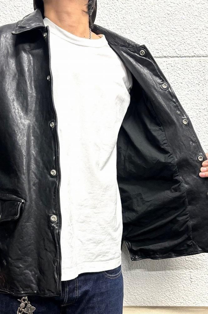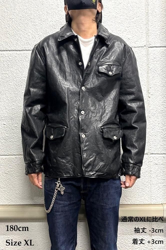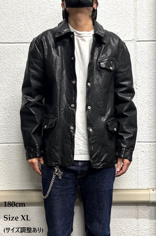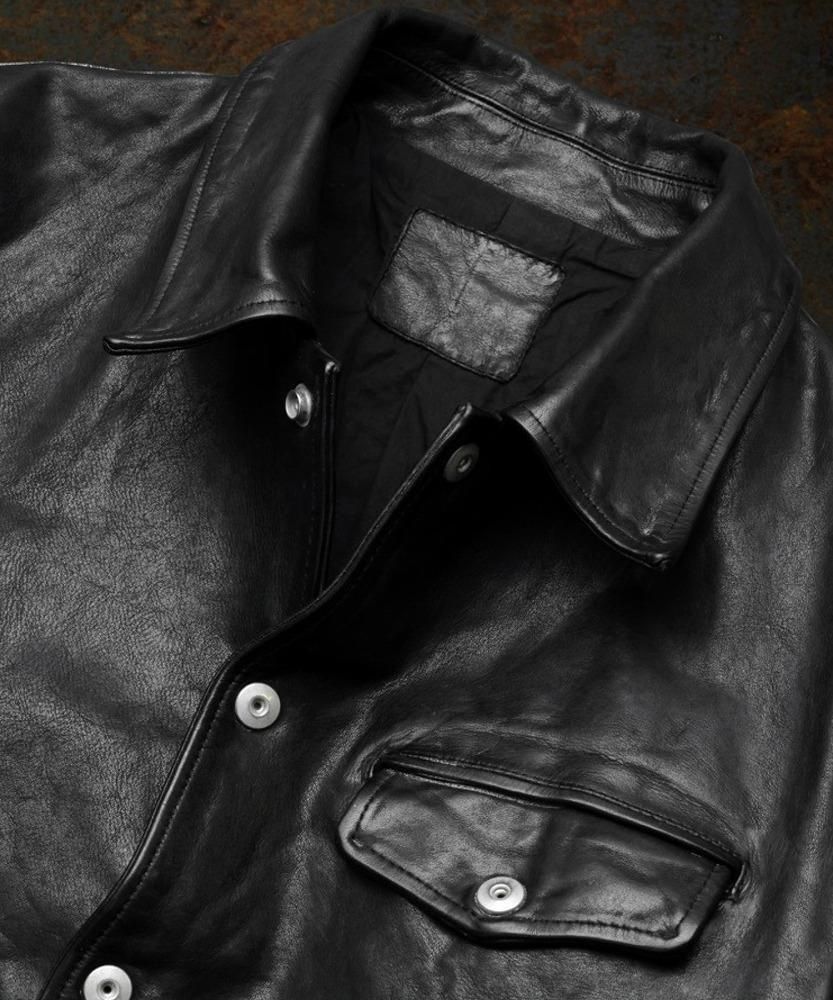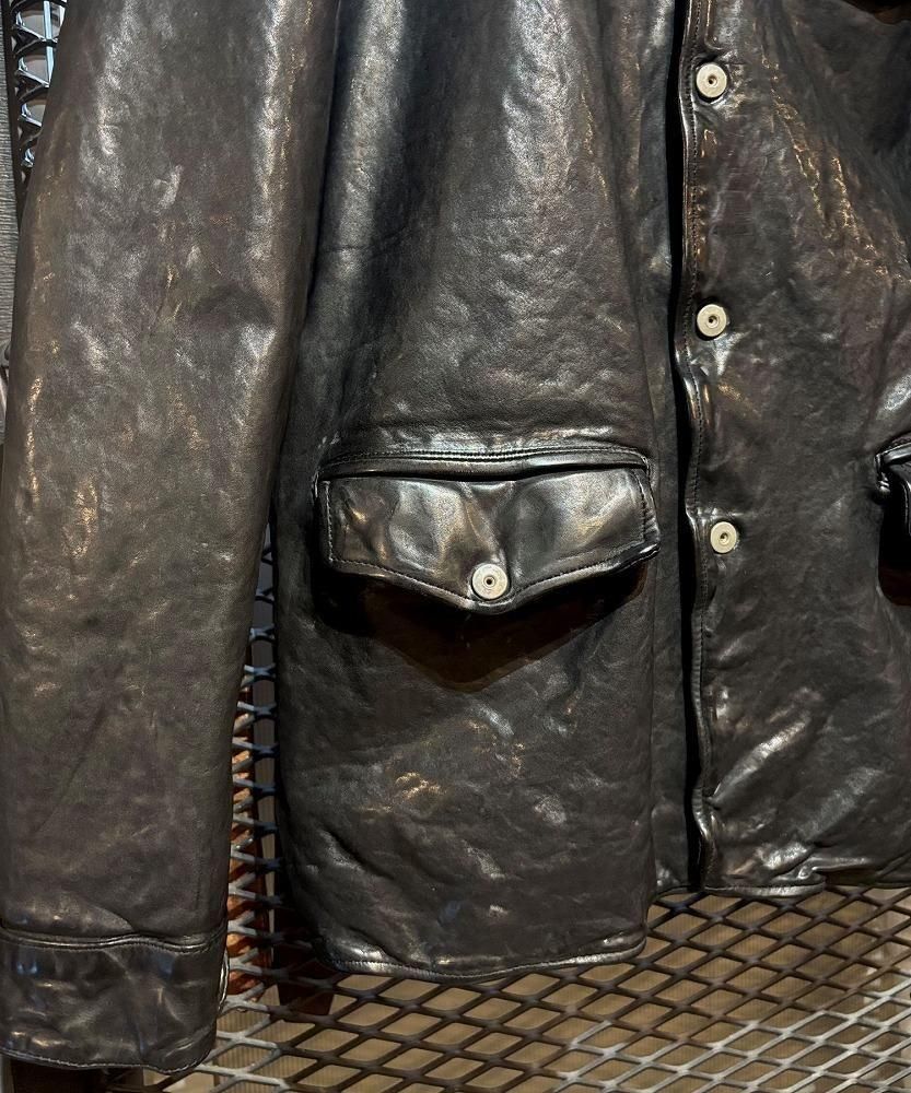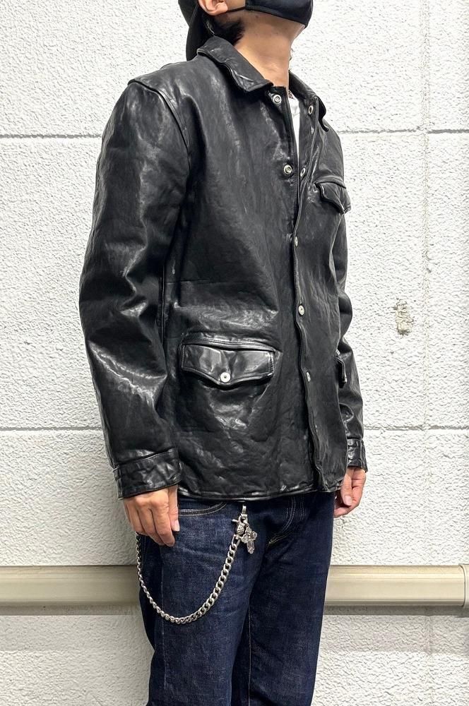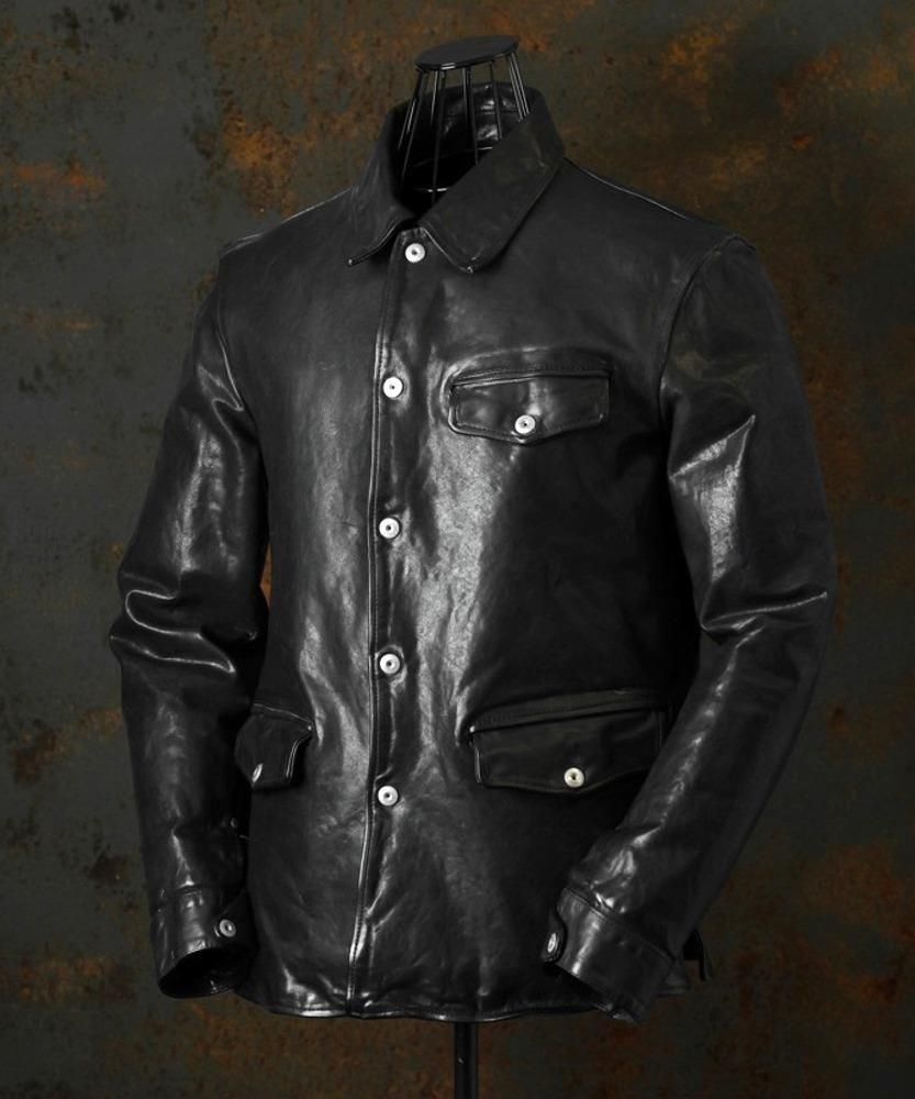 コートベースの程よく余裕を持たせたピッチで設計したボディラインにジャケット丈にモディファイした設計された新型となるカーコート。革の表情をストレートに表現した横向きにハギを入れることのないデザイン、フロント/カフスのボタンをドットホックの採用や、腰位置に加えて左胸ポケットに1箇所フラップポケットを配備したブランドオリジナルイメージを表現しています。