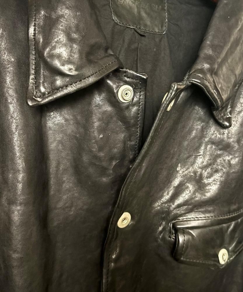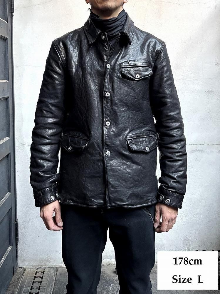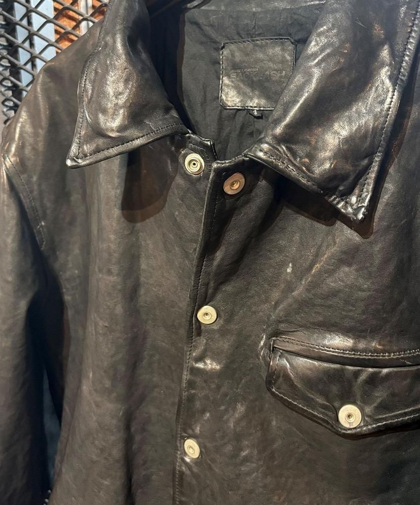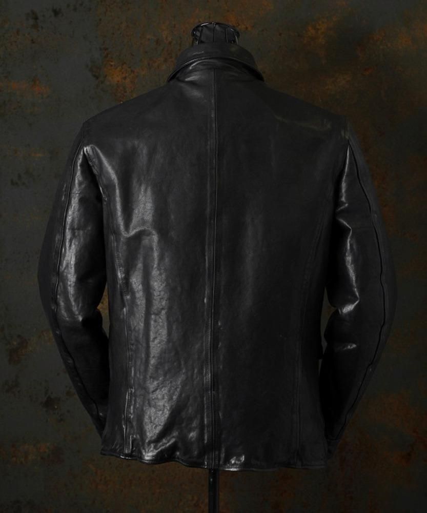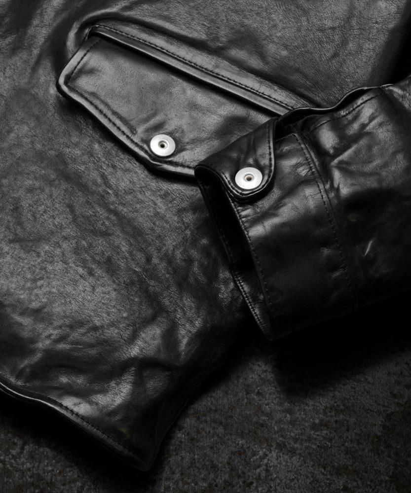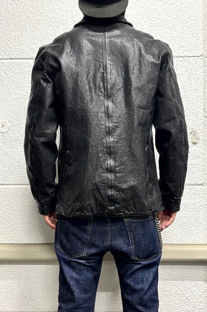 0.8-0.9mm厚のフランス産ダブルショルダーの皮をタンニン鞣しした下地を採用。多分にオイルを含んだ下地をベースに、製品染色を施工。製品染色の段階で仕上がりの色に比べ、低い濃度に染色し、その後表面にワックスをかけた状態でアイロンを当て熱量のコントロールによって焦がし色を濃く仕上げています。製品染色による陰影を伴ったムラのある表情に、ワックス焦がしの加工行程が加わることにより一層アジのあるやれこなしたような適度なナチュラルヴィンテージの風合いを表現しています。イタリアンダブルショルダー製品染めシリーズとはまた異なる独自の存在感を放つ一着。成牛の肩の部分の革を使用した肉厚で重厚感のある硬質な質感が基ですが、ワックスの油分感が加わったヌメりのあるプルアップレザー特有の質感。適度なハリのある最初のハードな感覚は、着用を重ねる毎にしっとりと柔らかく、艶感が変化しより一層味わいのある雰囲気に深化していきます。