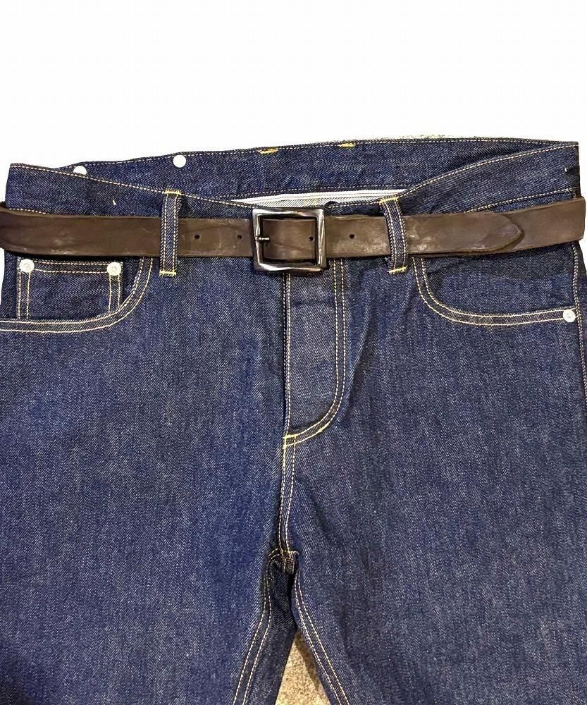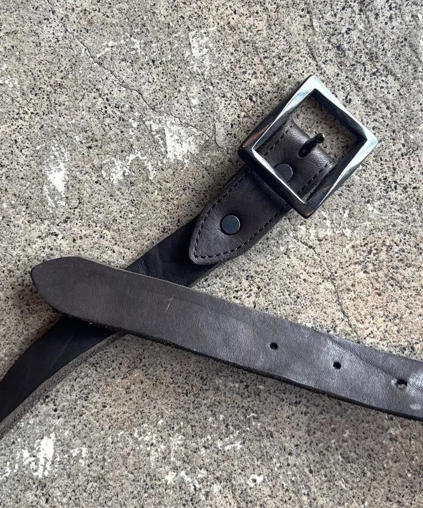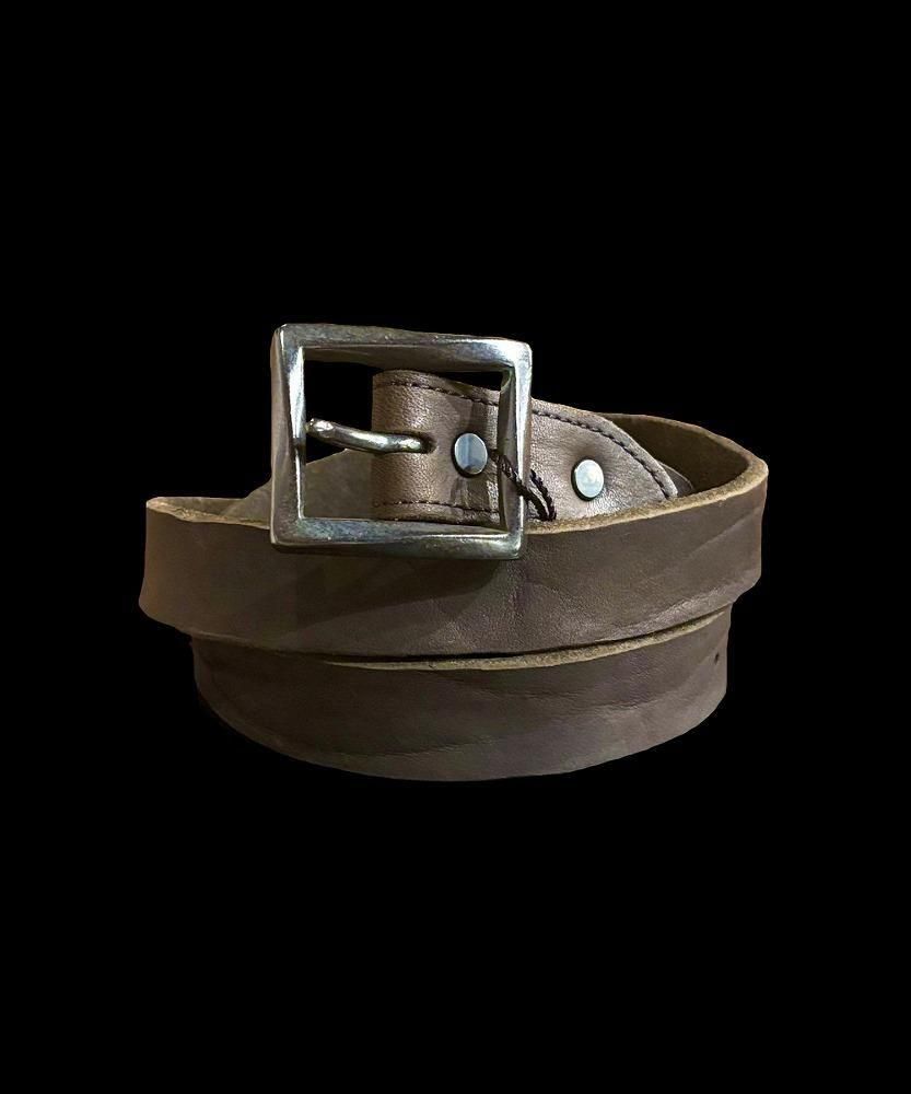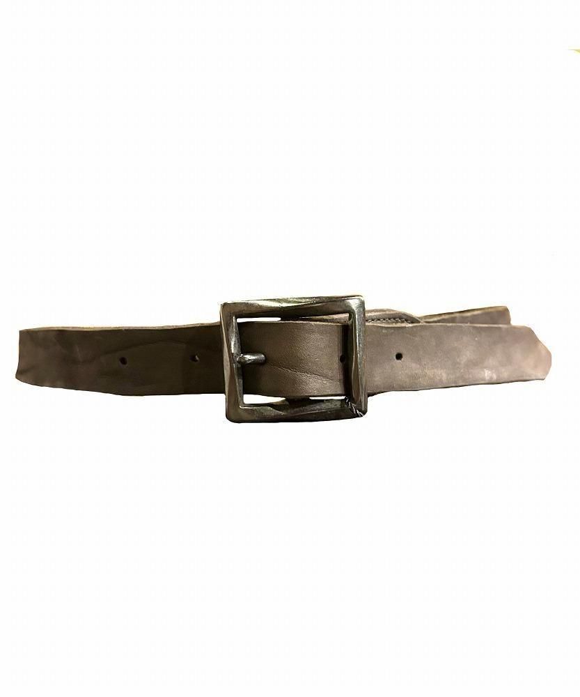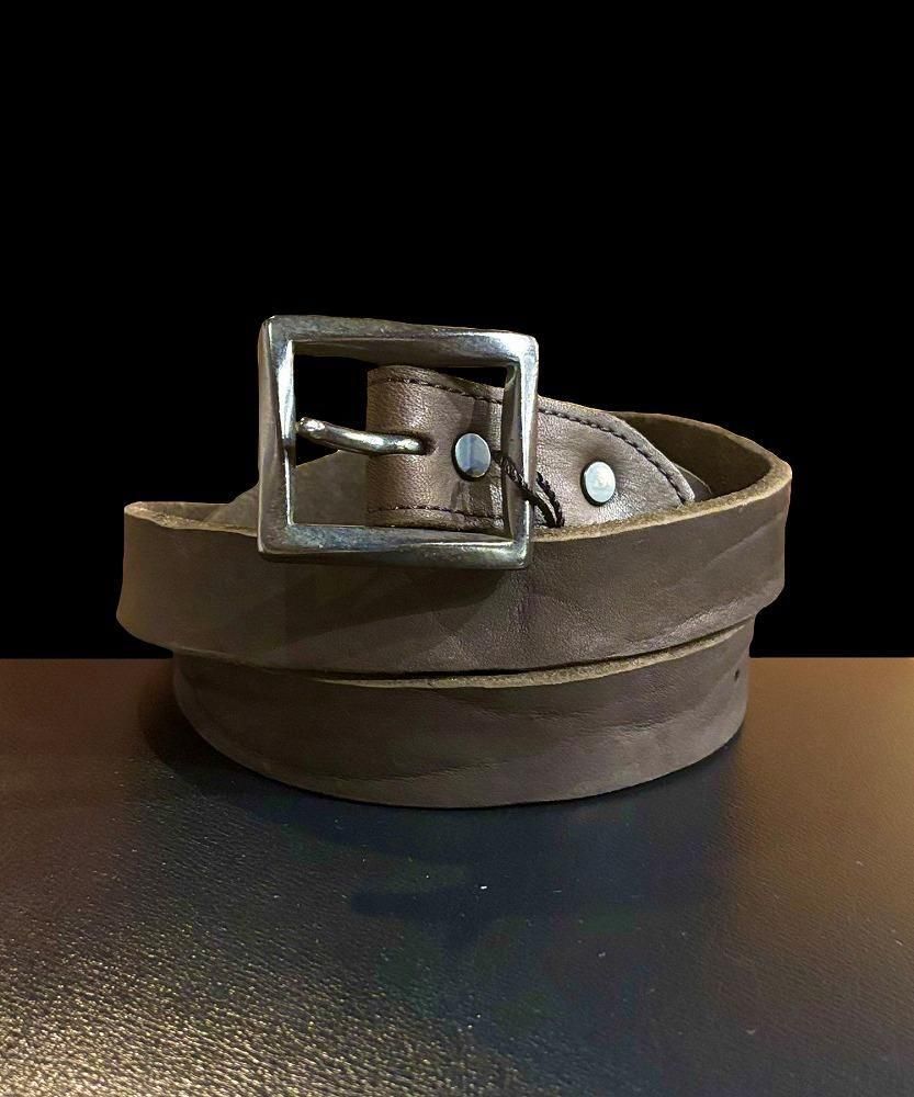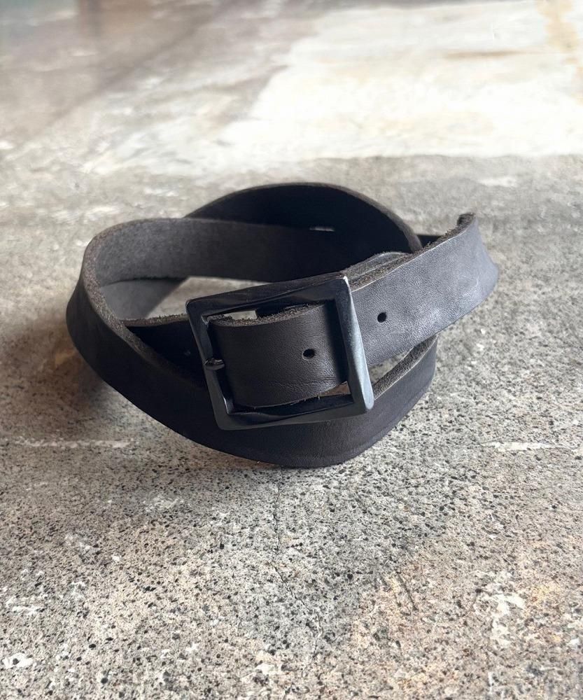 荒さを持った迫力のあるダブルショルダー製品染めベルトシリーズの中で、これまで展開のなかった30mm巾を新たに展開。40mmや50mmと比較すると細巾の印象ですが、革の表情も加わり十分な存在感を感じていただけます。形状はシンプルなものの適度な重厚感をもたらす真鍮製スクエアバックルを装着したベルトになります。ベルトの剣先はV字型になります。