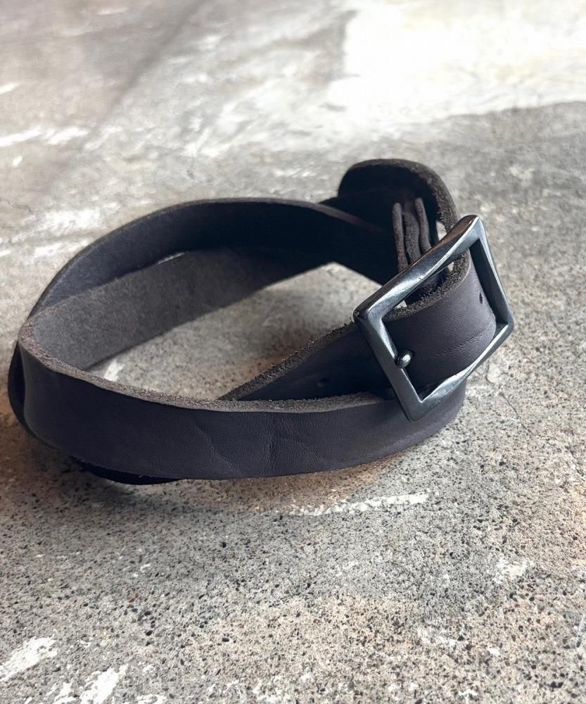ブランドを代表する国内のタンナーにより丁寧に仕上げられた高品質国産ダブルショルダーレザーを採用。極めて元厚に近いショルダーレザーの下地を敢えてそのまま使用し、更に製品染め加工を施すことにより粗野でいて存在感の強い風合いを作り上げています。製品基のカサっとした質感は使用に伴い油分が浮き上がり、驚くほどに滑らかな艶のある表情に変化します。デイリーユースのベルトこそのダブルショルダーレザー特有の硬質な質感が柔軟に深化するエイジングを最も感じていただきやすいプロダクション。使用者のみが堪能することが出来る唯一無二のレザーベルトです。
