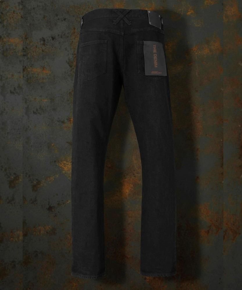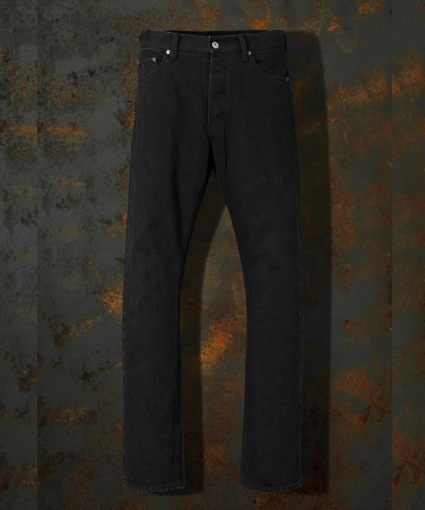 タテ7番黒糸、ヨコ8番黒糸を使用し、タテ糸ヨコ糸の太さを変えて織り上げたストレッチ混の、" HIROSHIMA (広島)セルビッチデニム "をベースマテリアルに採用しております。"ワンウォッシュブラック"に関しては、ヨコ糸も黒糸を用いることでシンプルにワンウォッシュを施した際にも、濃い黒の色は残り長くご着用いただく上でも持続性のある黒デニムに仕上がっています。