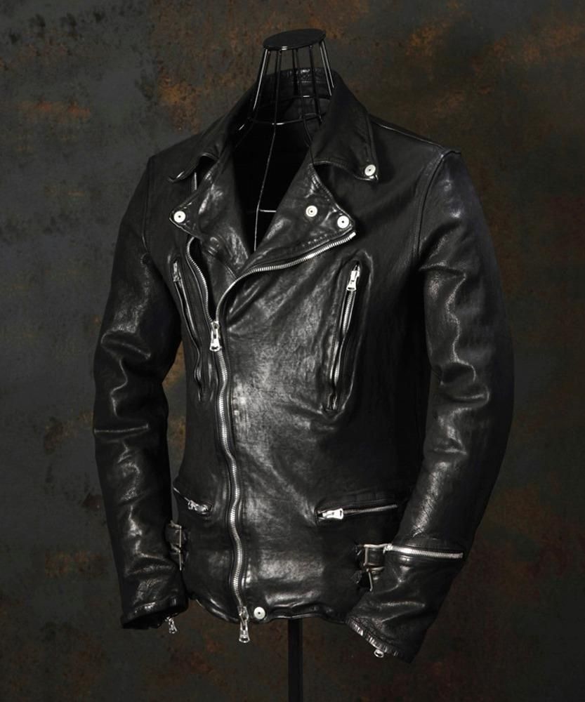 ベーシックなデザインのダブルライダースをブランドオリジナルパターンでソリッドに構築。胸部に垂直に、下方に水平2本ずつ計4本のファスナーポケットを配備、腰部の両サイドには前方に向かってダブルストラップのアジャスターを装着した英国らしさを感じさせるデザインを使用しています。高級レーヨンファブリックを裏地に採用することにより、非常に袖通しの良いライニング。ファスナーにはYKK社製高級タイプのEXCELLA(エクセラ)を採用、引手には実用性を考慮したブランドオリジナルデザイン。