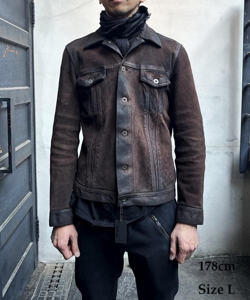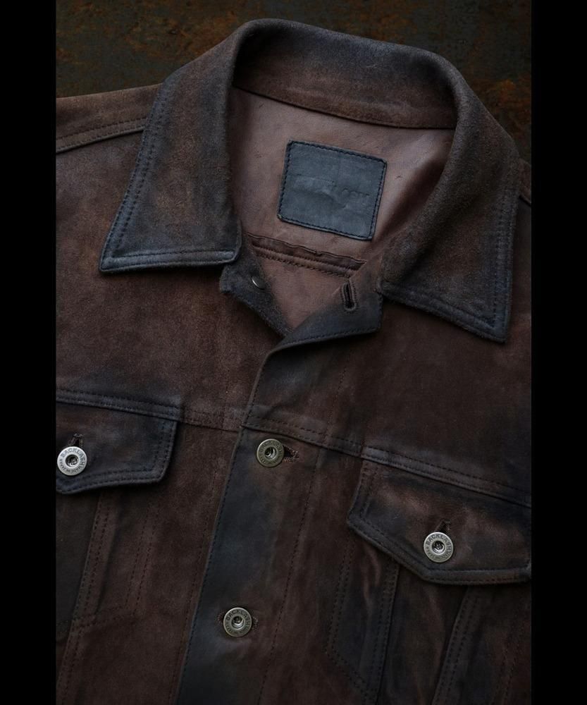 0.8-0.9mm厚のジャパンホースレザーを採用。「タンニン鞣し」,「クロム鞣し」二つの鞣し方法を組み合わせたコンビ鞣しにて仕上げた国産馬革を採用することで、タンニン特有のエイジングを実現しつつ、クロム特有の非常に柔らかく伸縮性に優れたフィット感を実現しています。丁寧に処理/染色が施されたスエードレザーを裁断、縫製を行い製品の状態にした後に、洗いによる収縮加工を施し風合いを作り出しています。さらに仕上げ工程で一着一着シワ加工に加えて、ワックス/アイロンを用いスエードレザージャケットの着用を重ねていくうちに生じるエイジングの表情を、適度な度合いで加工によりプラスしています。加工により作られた熟れた風合いからリアルに着用による一層味わいのある雰囲気への深化への期待値が高く、ハードな着用においても傷や水に対して通常の皮革製品よりも高い耐性を持つコンビ鞣しの特性が活かされます。