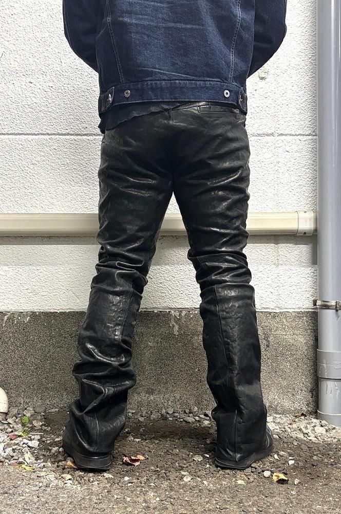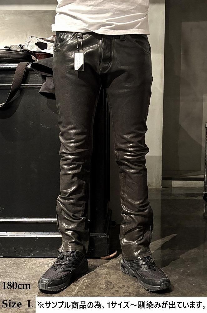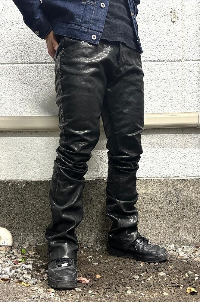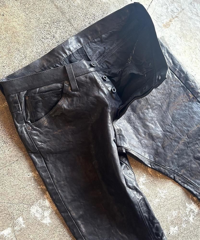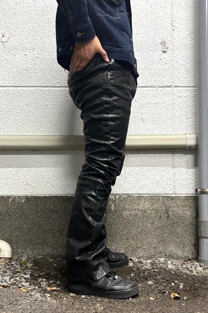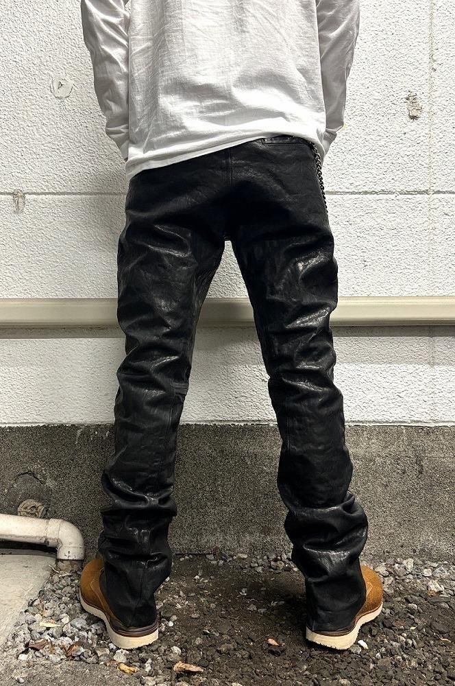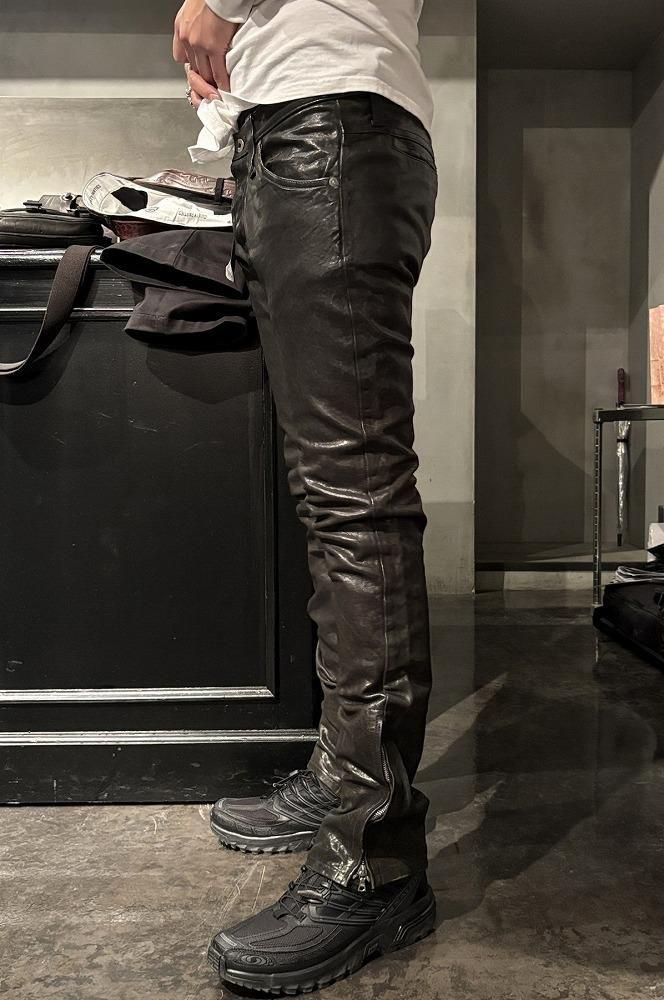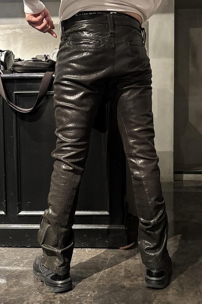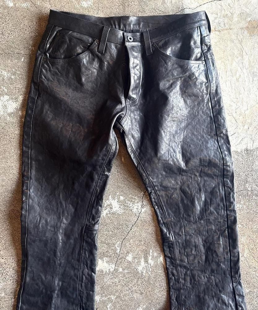 全体的にタイトフィットでシャープな脚線美を意識したタイトストレートシルエット。"1254シリーズ"の皮革種の特性を活かしたスリムシルエットは、製品元は窮屈な感覚も着用していくうちに着実に心地の良いフィット感に変貌していきます。フロントボタンフライ、レザーパンツとして他に類を見ないインパクトのある一本になっています。