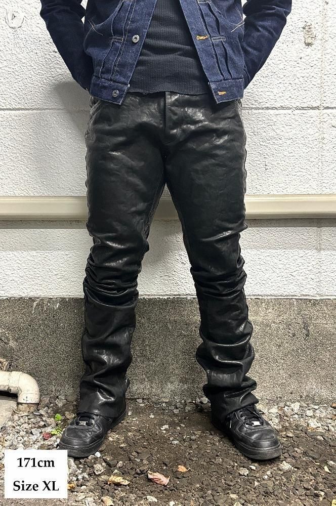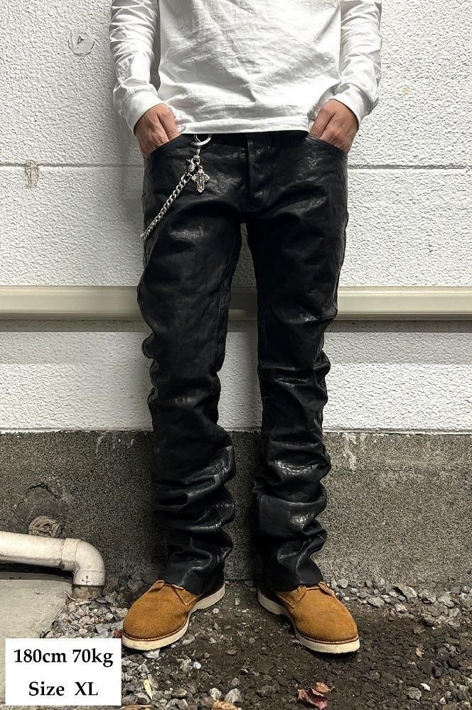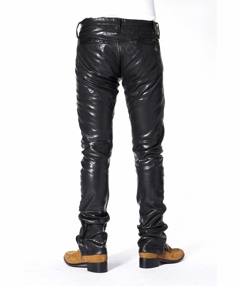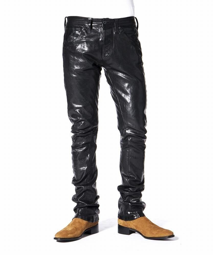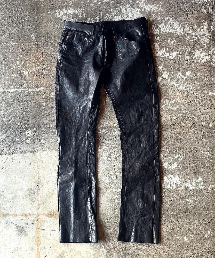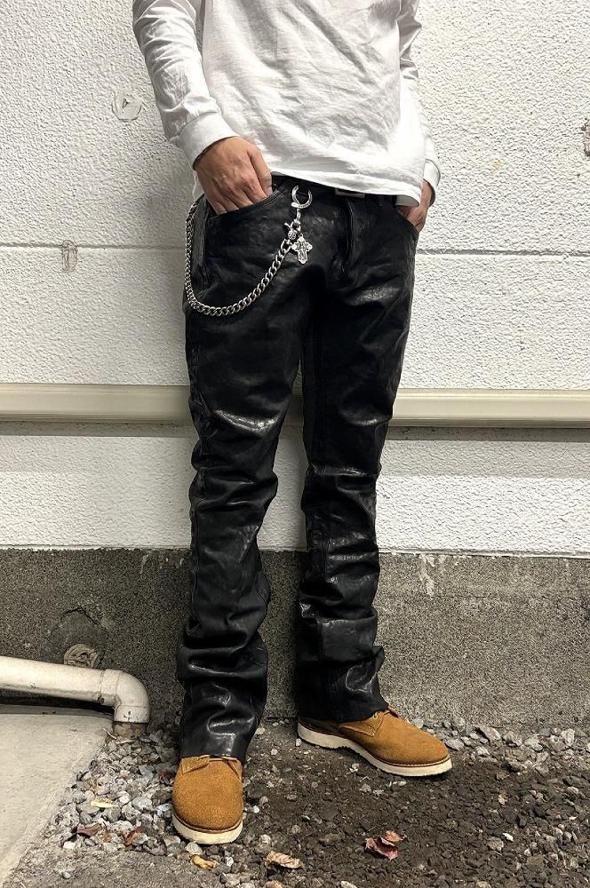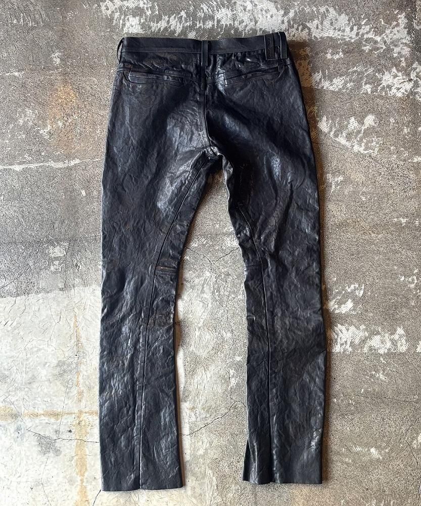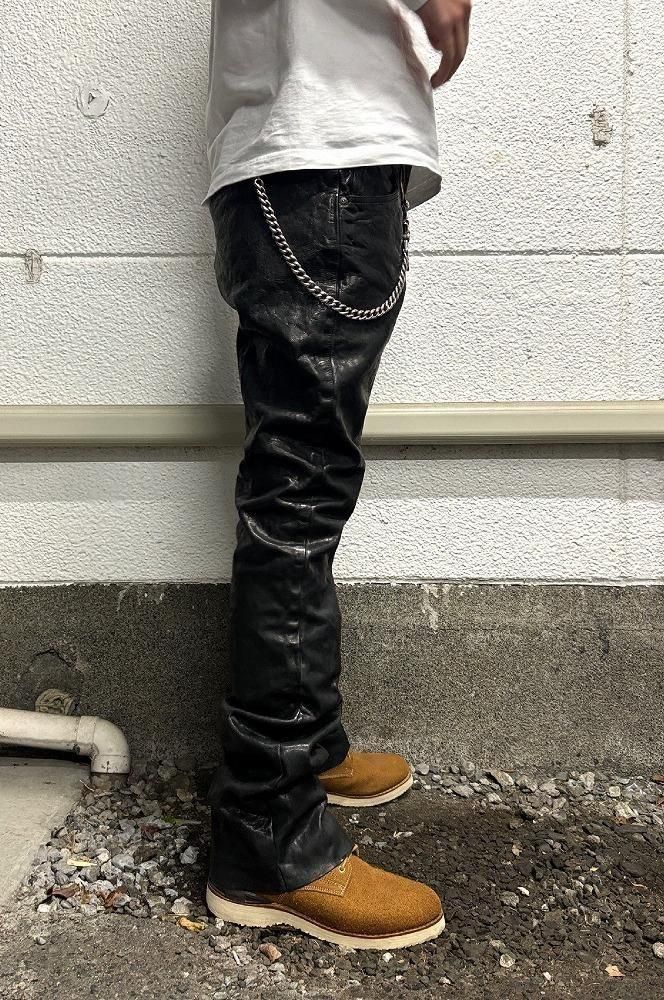 全体的にタイトフィットでシャープな脚線美を意識したタイトストレートシルエット。"1254シリーズ"の皮革種の特性を活かしたスリムシルエットは、製品元は窮屈な感覚も着用していくうちに着実に心地の良いフィット感に変貌していきます。フロントボタンフライ、レザーパンツとして他に類を見ないインパクトのある一本になっています。